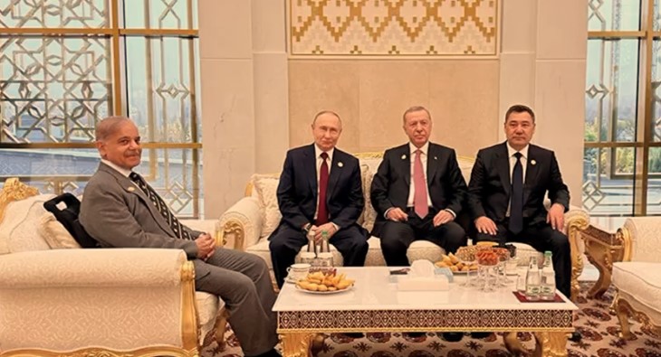 A video clip released by the Prime Minister’s Office showed Prime Minister Shehbaz warmly holding hands with Russian President Putin and Kyrgyz President Zhaparov while engaging in separate conversations with them.