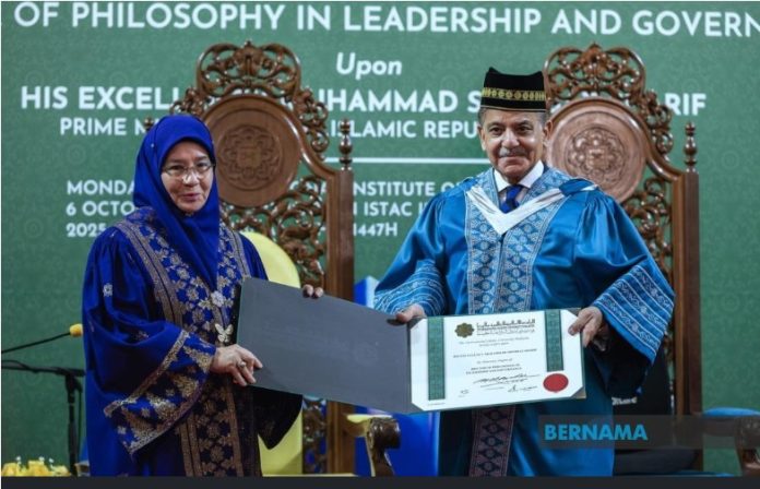 KUALA LUMPUR, Oct 7 (APP): The International Islamic University of Malaysia (IIUM) on Tuesday conferred an Honorary Degree of Doctor of Philosophy in Leadership and Governance on Prime Minister Muhammad Shehbaz Sharif in recognition of his outstanding leadership and contributions to nation-building.