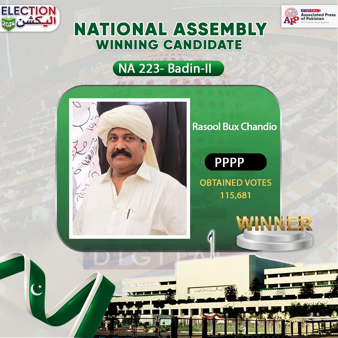 ISLAMABAD, Feb 9 (APP): Pakistan People’s Party Parliamentarian candidate Haji Rasool Bakhsh Chandio has won the election for National Assembly constituency NA-223 Badin-II by securing 1,15,681 votes.
