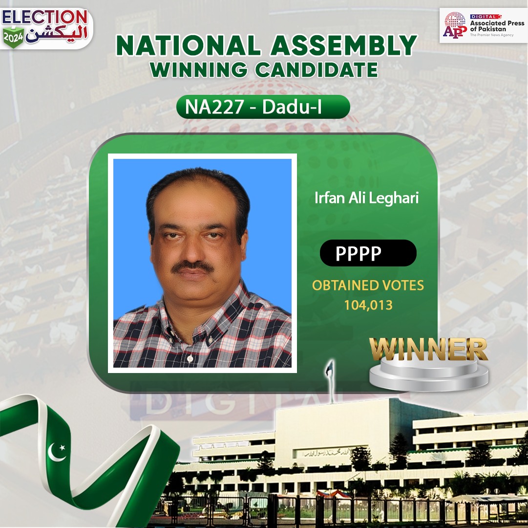 ISLAMABAD, Feb 9 (APP): Pakistan People’s Party Parliamentarian (PPPP) candidate Irfan Ali Laghari has won the election for National Assembly constituency NA-227 Dadu-I by securing 104,013 votes.