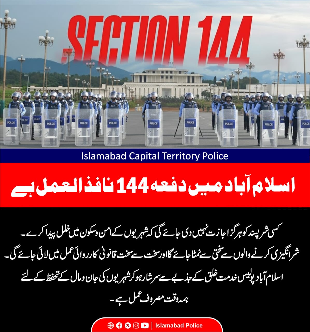 ISLAMABAD, Dec 01 (APP): Islamabad Capital Territory (ICT) Police on Monday warned citizens to strictly comply with Section 144, which is currently enforced in the federal capital, under which all public gatherings, protests, or rallies have been prohibited.