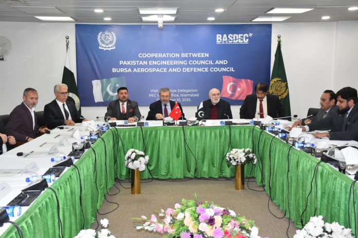 The delegation, representing the Bursa Aerospace and Defence Cluster Association (BASDEC) and Turkiye’s Defence Industry Agency, met PEC Chairman Engr. Waseem Nazir, who briefed them on PEC’s reforms, digital modernization, international accreditation and efforts to align Pakistan’s engineering sector with global standards.