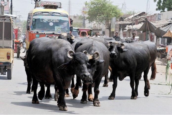 A herd of buffaloes walking freely on Vehari road creates a hurdle in the smooth traffic flow.