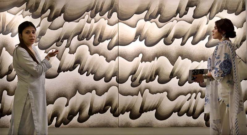 Visitors keenly viewing art work during an exhibition featuring a joint creative interpretation of Iqbal’s Urdu and Persian poetry “…tar-e-harir-e do rang” by artists Shah Abdullah Alamee and Amna Manzoor at Tanzara Art Gallery.