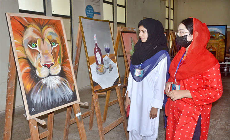 MULTAN: May 08 – Students taking selfie in front of paintings from different universities of South Punjab in the first South Punjab art exhibition competition organized by Women’s University Multan.