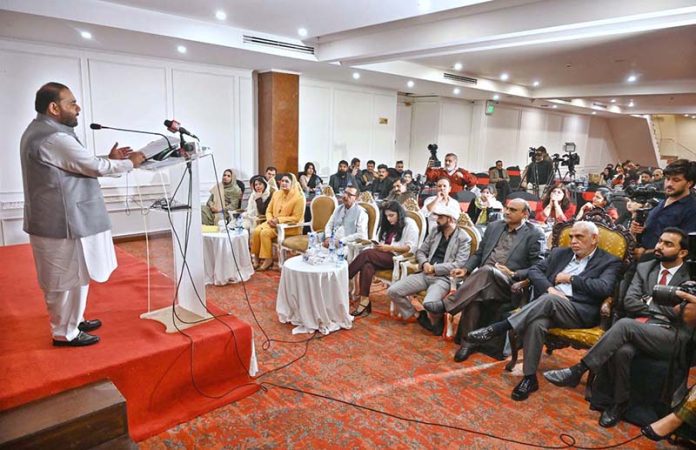 ISLAMABAD: November 26 – Federal Minister for National Heritage & Culture, Mr. Aurangzeb Khan Khichi, addresses the “Growing Women Rebuild Pakistan Event 2025” during the MoU signing ceremony between Growing Women Foundation and Sindhu Welfare Foundation. APP/TZD/SSH