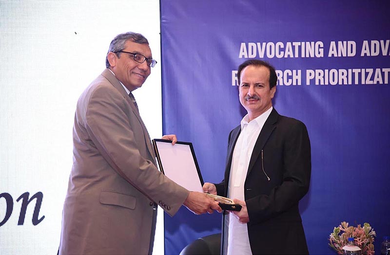Dr. Zulfiqar Bhutta Chairman Board of Governors NIH presenting a shield to Federal Health Minister Dr. Nadeem Jan at the concluding ceremony of National Health Research Conference.