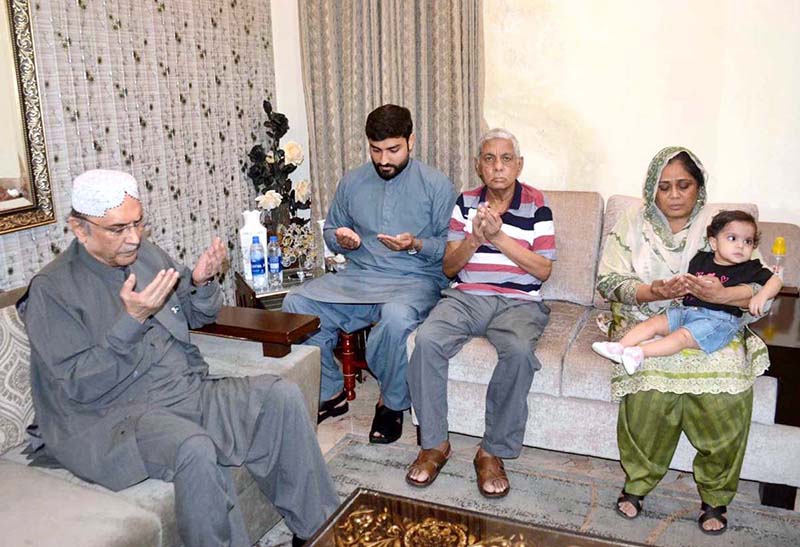 APP37-050924LAHORE: September 05 – APP38-050924LAHORE: September 05 – President Asif Ali Zardari offering Fateha over the martyrdom of Captain Muhammad Ali Qureshi Shaheed during his visit to Lahore. Previous Post Ulema unite for peace, justice in country Next Post Federal Minister for Finance and Revenue Senator Muhammad Aurangzeb in a virtual meeting with H.H. Juland Jaifer Salim Al-Said, Chairman of the Pak Oman Investment Company Limited (POIC).