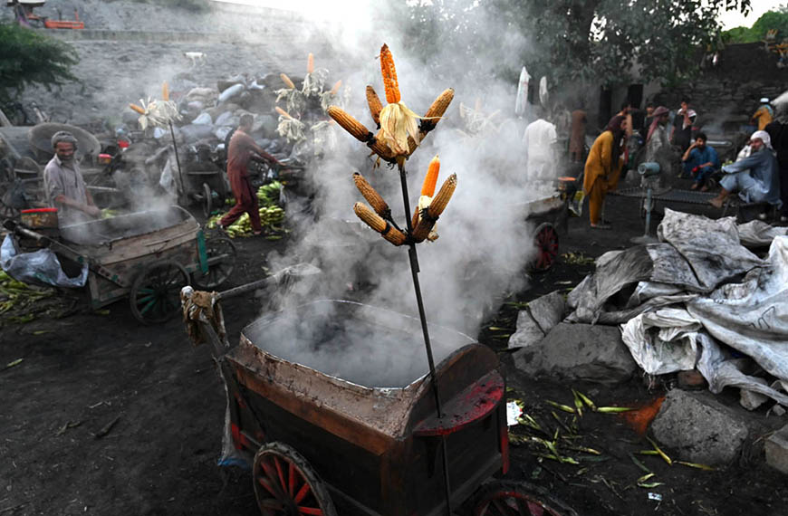 LAHORE: October 10- Hawkers skillfully loading freshly roasted corn onto their handcarts, ready to bring the enticing aroma of street food to eager customers at the local market.