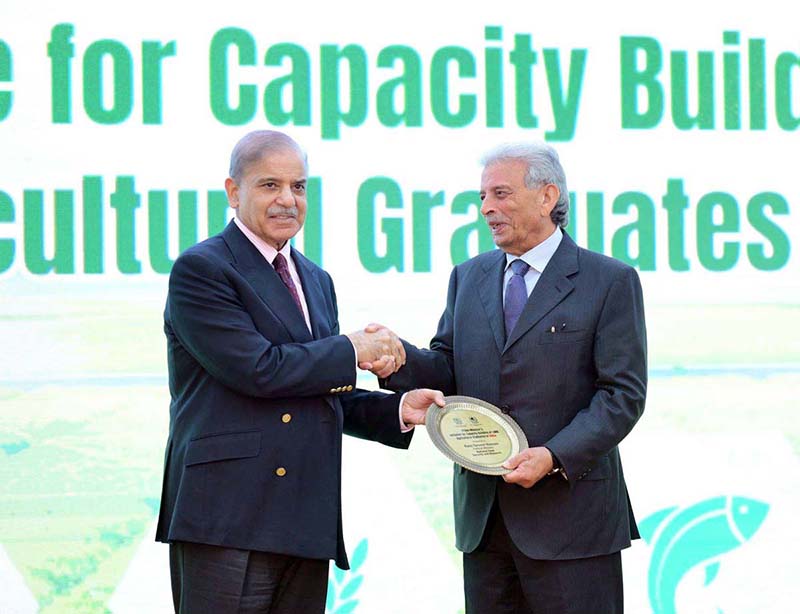 ISLAMABAD: April 16 – Prime Minister Muhammad Shehbaz Sharif awards shields to the team of Prime Minister’s initiative of sending 1000 agriculture graduates for training in China for capacity building of Agricultural Sector in Pakistan. APP/TZD