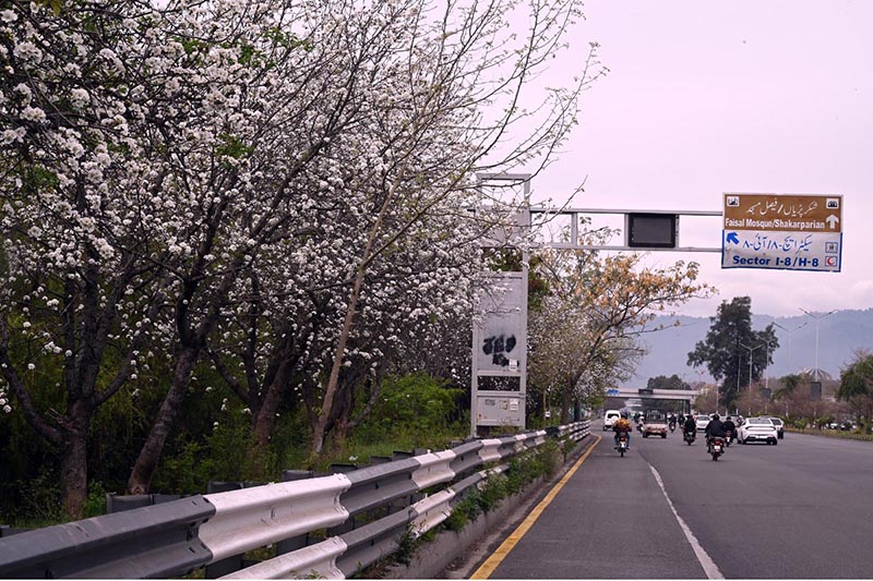 A beautiful view of flowers blooming on trees along expressway marking the arrival of the spring season in the Federal Capital