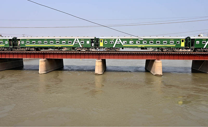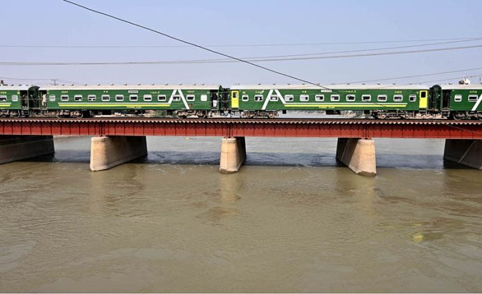 A beautiful view of train passing over a bridge on the water canal at Tando Yousuf area.