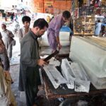 A blacksmith busy in preparing knives to be used for slaughtering sacrificial animals during upcoming Eid ul Azha. APP02-090624RAWALPINDI: June 09 – Previous Post People purchasing ice from roadside vendor near Railway Station as demand increased due to scorching hot weather in the city. Next Post A family on the way on motorcyclist during rain in the city.