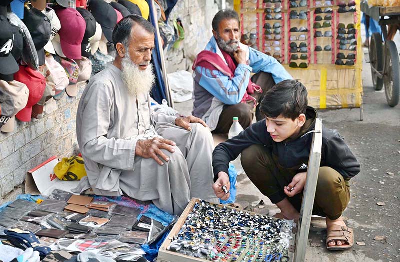 A boy selecting ring from road side vendor.