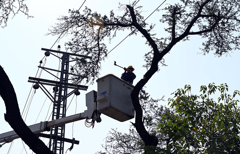 A CDA staffer cutting tree branches while standing on a crane in the Federal Capital