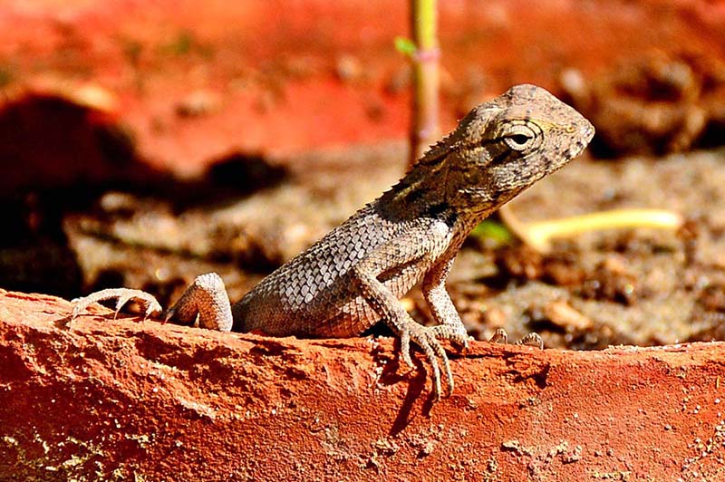 A chameleon sits atop a clay pot in a local park, camouflaging itself by blending into the earthen surroundings and offering a striking glimpse of nature to onlookers
