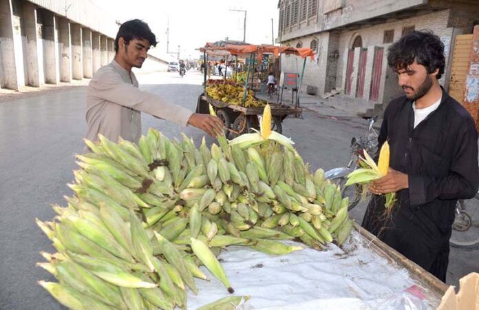 A corn hawker selling fresh corns in Quetta, emphasizing its nutrient-rich benefits to entice customers.