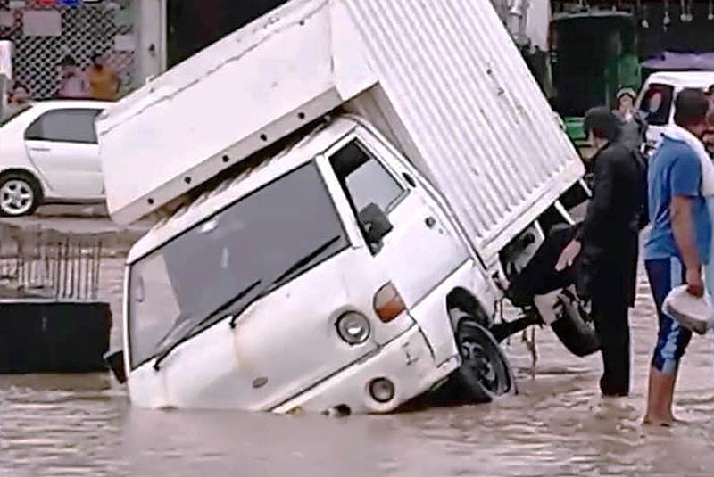 LAHORE: August 01 -Rescue crew pushes a stuck car from the floodwaters after a drain system