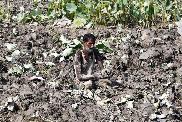 LARKANA: October 11 – Farmers busy plucking the traditional vegetable beeh in a farm field near Wada Mahar Village.