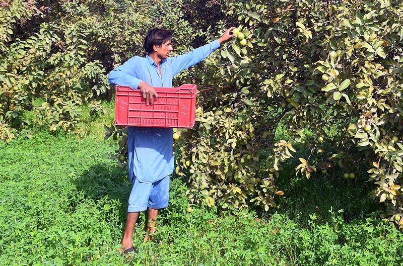 A farmer is busy plucking seasonal fruit Guava at his farm.