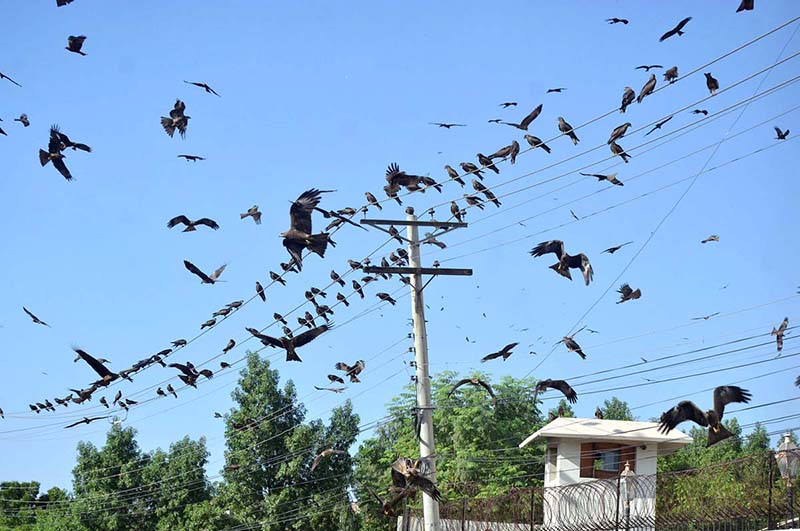 A flock of Kite birds (Cheel) sitting on high-voltage electric wires in a Blue sky background.