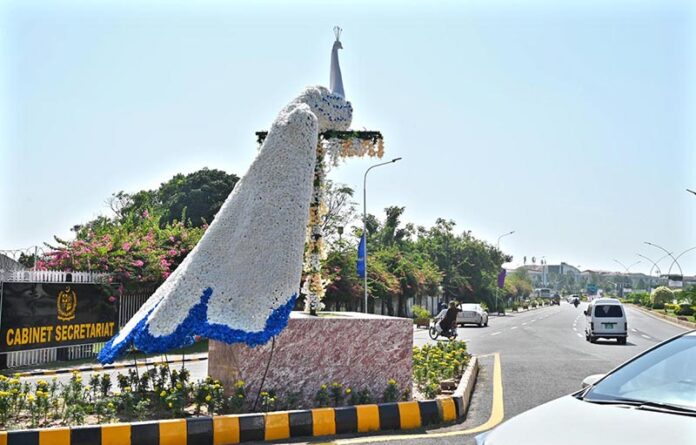 A floral peacock installation by CDA on Constitution Avenue ahead of the 23rd Shanghai Cooperation Organization SCO summit in Islamabad.