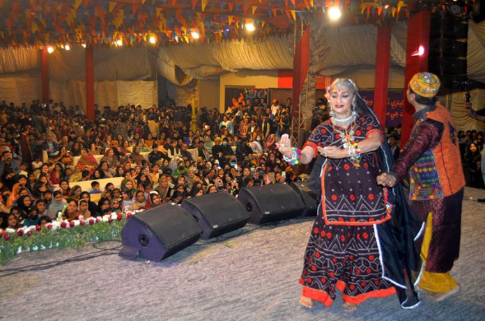 A folk artist Sema Kirmani performing folk dance during last day of 11th Ayaz Mela organized by Khana Badosh writers cafe Sindh Museum.