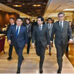 A girl in traditional Pakistani costumes presents flower bouquet to Prime Minister of Mongolia, Luvsannamsrain Oyun-Erdene, on his arrival in Pakistan to attend the 23rd SCO conference. Minister of State for Finance and Revenue, Ali Pervaiz welcomes the Prime Minister of Mongolia at Islamabad International Airport.