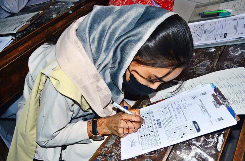 A girl student attempts her paper during the annual SSC (Part-I) Class 9 examinations at Government APWA Girls High School, Latifabad.