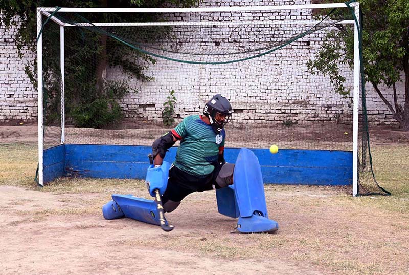SARGODHA: May 05 – A goalkeeper in full action during a friendly hockey match between Ali Amir Hockey Club and Mujahid Zafar Hockey Academy. APP/HSD/MAF/FAH/SSH