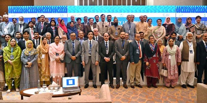 ISLAMABAD: June 18 – A group photo with Chairman Senate of Pakistan, Syed Yousuf Raza Gillani, Governor of Balochistan, Sheikh Jaffar Khan Mandokhail, and participants after the seminar on "Faculty Leadership & Management Excellence (FLAME) 2025", organized by the Higher Education Commission (HEC) at a local hotel. APP/SMR/TZD/SSH