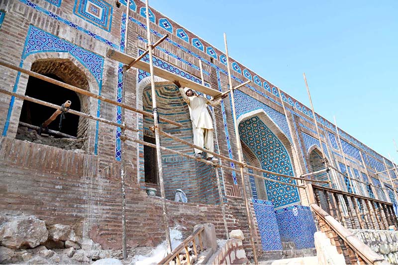 A laborer busy in construction work of Historic legacy of Seven Sisters Graveyard (Satin Jo Asthan Graveyard) Wall, dating back to the Mughal era during the reign of Abul-Qasim Namkin, the esteemed Ameer of Sukkur. In the early 11th Hijra, he arrived in Bakhr, where Mughal King Akbar granted him Jageer. A connoisseur of literature and art, Abul- Qasim Namkin later transformed the hill into a family cemetery, embellishing it with four minarets and corners. Before becoming a graveyard, this location hosted gatherings, meetings and events aptly named "Safae Safa." Referenced in the book "History of Sukkur" by Sindh's renowned historian Rahmidad Molai Shidai, the first grave of Abul-Qasim Namkin was established in 1018 Hijra. The architectural style of the tombs reflects Mughal and Tarkhan influences, adorned with intricate engravings. Legend has it that this site holds stories of seven women seeking refuge from tyrants. Upon reaching this sacred place, they found sanctuary in the mountain, disappearing into its depths. Although lacking historical references, some believe it to be the dwelling of seven elders or elderly women. Today, it stands as a captivating historical site nestled between Sukkur and Rohri at Left Bank of Indus River. Constructed on the mountain in the 17th Hijra, from 1018 AH to 1070 AH (equivalent to 1609 AD to 1659 AD), these tombs showcase small minarets and platforms attached to the hill, with covered floors. Predominantly belonging to the family of Mir Abul-Qasim Namkin, other hills nearby also house graves of notable personalities from that era