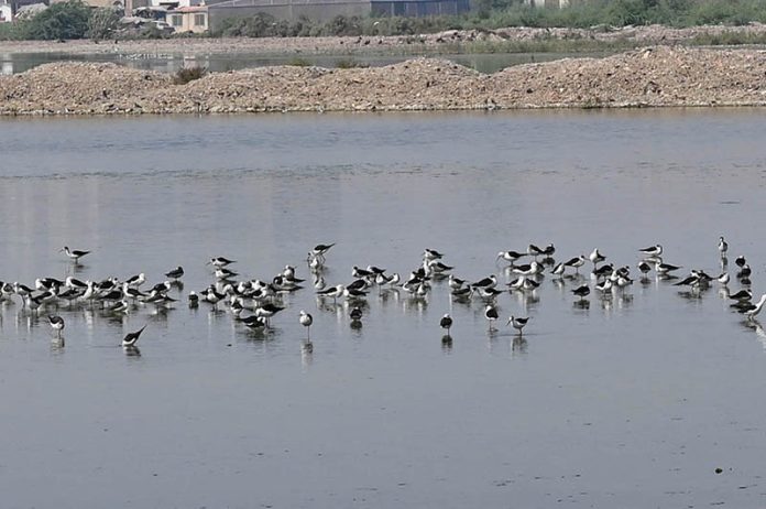 A large flock of migratory birds gathers around stagnant water at the Cantonment Ground.
