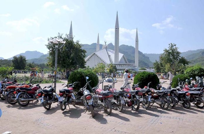 ISLAMABAD: July 02 – A large number of motorcycles parked in the premises of Shah Faisal Masjid as people visit on weekend. APP/SAK/ABB - Advertisement -