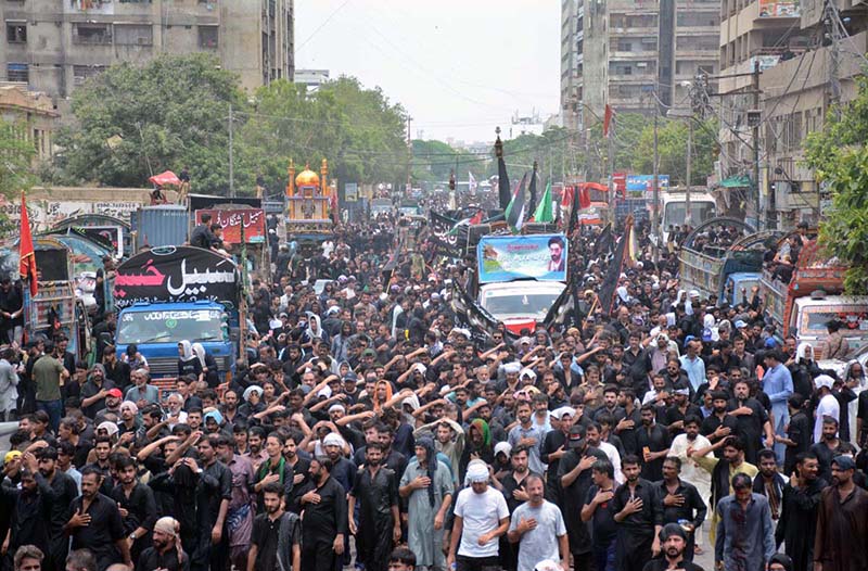 KARACHI: July 17 – A large number of mourners attending the Ashura procession on 10th of Muharram-ul-Harram at Empress Market, Sadar. Muharram is the mourning month in remembrance of the martyrdom (Shahadat) of Hazrat Imam Hussain (RA), the grandson of the Holy Prophet Mohammad (PBUH).