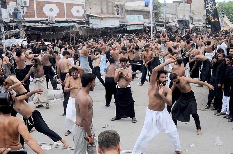 MULTAN: July 28 – Mourners flogging themselves with chained knives during the Aashura procession on 9th Muharram-ul-Haram in remembrance of the martyrdom (Shahadat) of Hazrat Imam Hussain (AS), the grandson of the Holy Prophet Mohammad (SAWW) and other martyrs of Karbala incident. APP/SFD/ABB