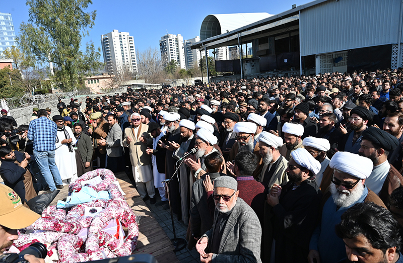 ISLAMABAD: February 07 – A large number of people attend funeral prayers at Imambargah Al-Sadiq in Sector G-9/2 for the victims of the suicide attack on Imambargah Khadijat-ul-Kubra in Tarlai Kalan. APP/SMR/ABB