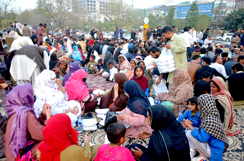 ISLAMABAD: February 28 – A large number of people from slum area receiving food to break their fast at a free Iftar reception by AWP in the holy month of Ramazan ul Mubarak. APP/SMR/ABB