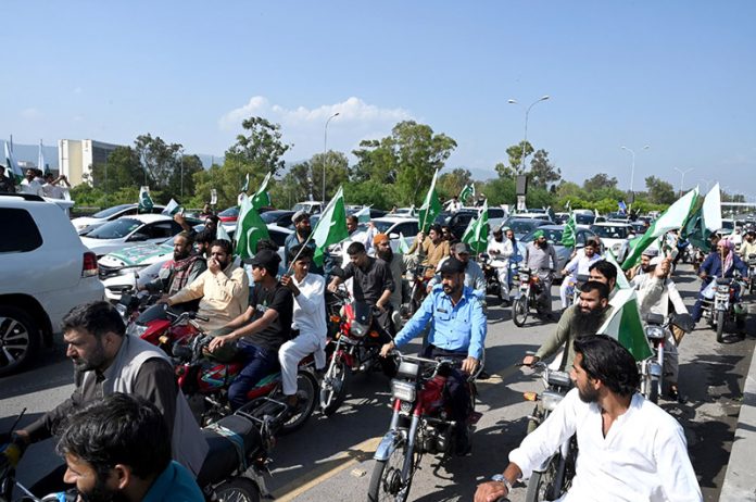 ISLAMABAD: May 10 – A motorist displaying a huge Pakistan flag participating in rally to express solidarity with the Pakistan Armed Forces in the federal capital. APP/ADZ/ABB