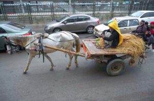 A man shields himself with a plastic sheet as he rides his horse cart in the drizzle on the roads in the Provincial Capital.