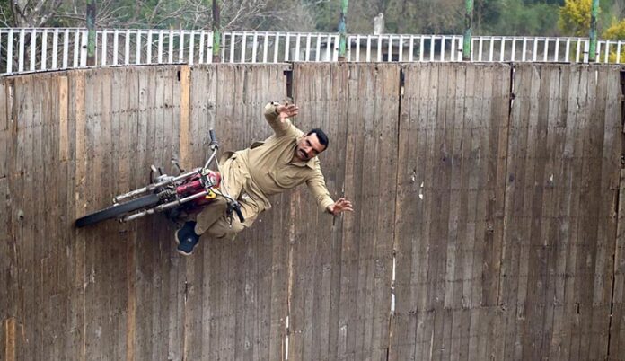 ISLAMABAD: February 26 – A motorcyclist demonstrates his skills while riding a motorcycle in the ‘Well of Death’ at the Lucky Irani Circus in F-9 Park. APP/IFD/MAF/TZD