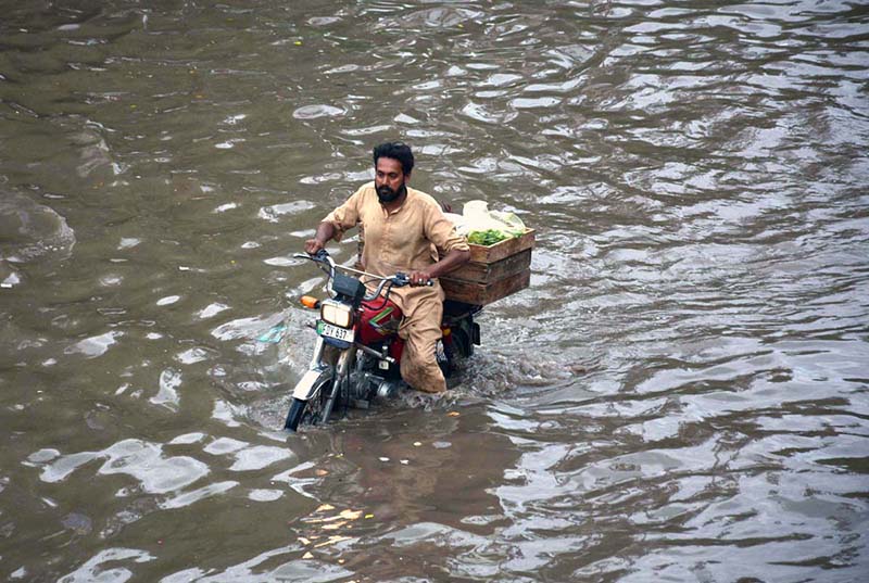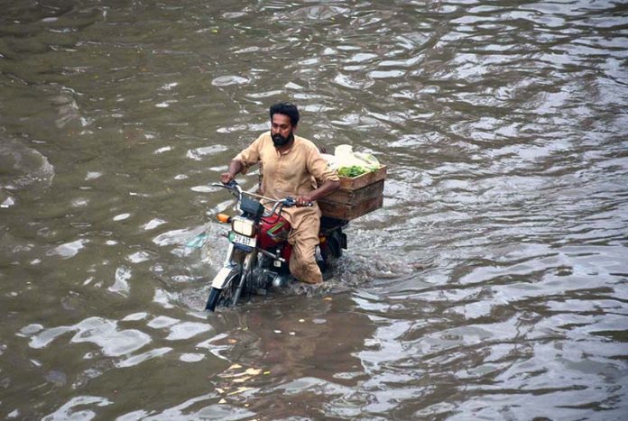 FAISALABAD: October 06 – Vehicles passing through stagnant rain water accumulated at Nishatabad after heavy rain in the city. APP/TWR/MAF/TZD/ABB