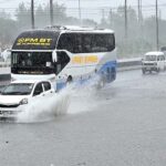 A motorcyclist rides through heavy rain on the Islamabad Expressway, facing reduced visibility and slippery road conditions due to torrential rain .