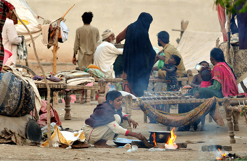 MULTAN: October 03 - A nomadic woman cooks over an open flame as families rest on cots in a makeshift shelter, demonstrating the resilience of displaced people in difficult circumstances. APP/QSM/MAF/FHA/SSH