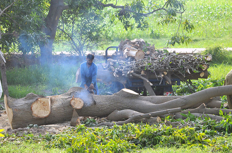 A person uses chainsaw to cut down a tree in a rural area, contributing to deforestation and raising concerns over the loss of green cover, which threatens ecological balance, local livelihoods and the environment in the long term.