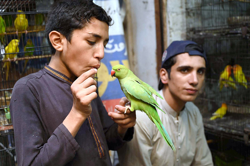 A pet lover purchasing a green parrot at Chargano Market in the provincial city