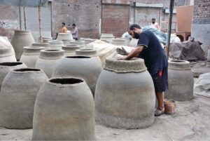 A potter busy in preparing traditional clay oven (tandoor) at his workplace–