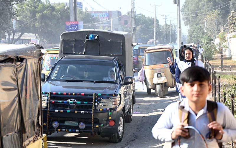 SARGODHA: December 08 – A Punjab Police official vehicle engaged in the private transportation of a student near Rehmat-ul-lil-Alamin Park in Satellite Town, highlighting public complaints regarding the non-official use of state-owned vehicles. APP/HSD/TZD/SSH