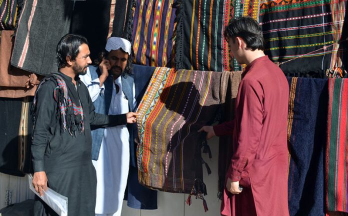A roadside vendor displays handcrafted shawls and chadars in rich traditional hues, inviting passersby to experience the warmth and cultural heritage of Balochistan.