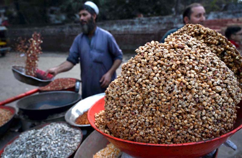 LAHORE: February 10 - A roadside vendor roasts peanuts and grams and sells various dry fruits to customers in the provincial capital. APP/MTF/TZD/FHA